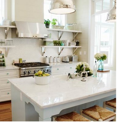 We kept the original cabinets (in the peninsula) as well as the granite countertop. No comments for kitchens with shelves instead of upper cabinets.